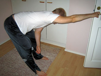 Oikea puoli venytettävänä. Seiso pienessä haara-asennossa. Ota venytettävän puolen kädellä kiinni esim. oven kahvasta tai karmista niin, että olkanivel ulkokiertyy. Kumarru siitä eteenpäin ja anna kehosi painon vetää sinua taaksepäin. Venytyksen tehostamiseksi, päästä vielä vartalosi painoa venytettävälle puolelle. |