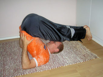 Lähtöasento on selinmakuulla lattialla. ”Heitä” siitä jalkasi pään yli lattialle tai niin pitkälle kuin mahdollista. Voit tukea käsillä itseäsi lantiosta ja jalkapohjilla seinästä. |